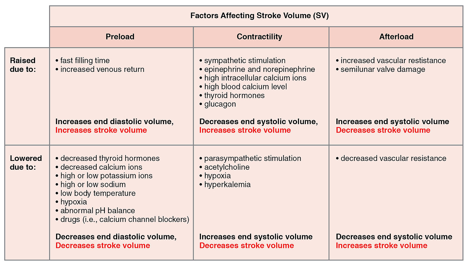 • Summary of Major Factors Influencing Cardiac Output: The primary factors influencing HR include autonomic innervation plus endocrine control. Not shown are environmental factors, such as electrolytes, metabolic products, and temperature. The primary factors controlling SV include preload, contractility, and afterload. Other factors such as electrolytes may be classified as either positive or negative inotropic agents.