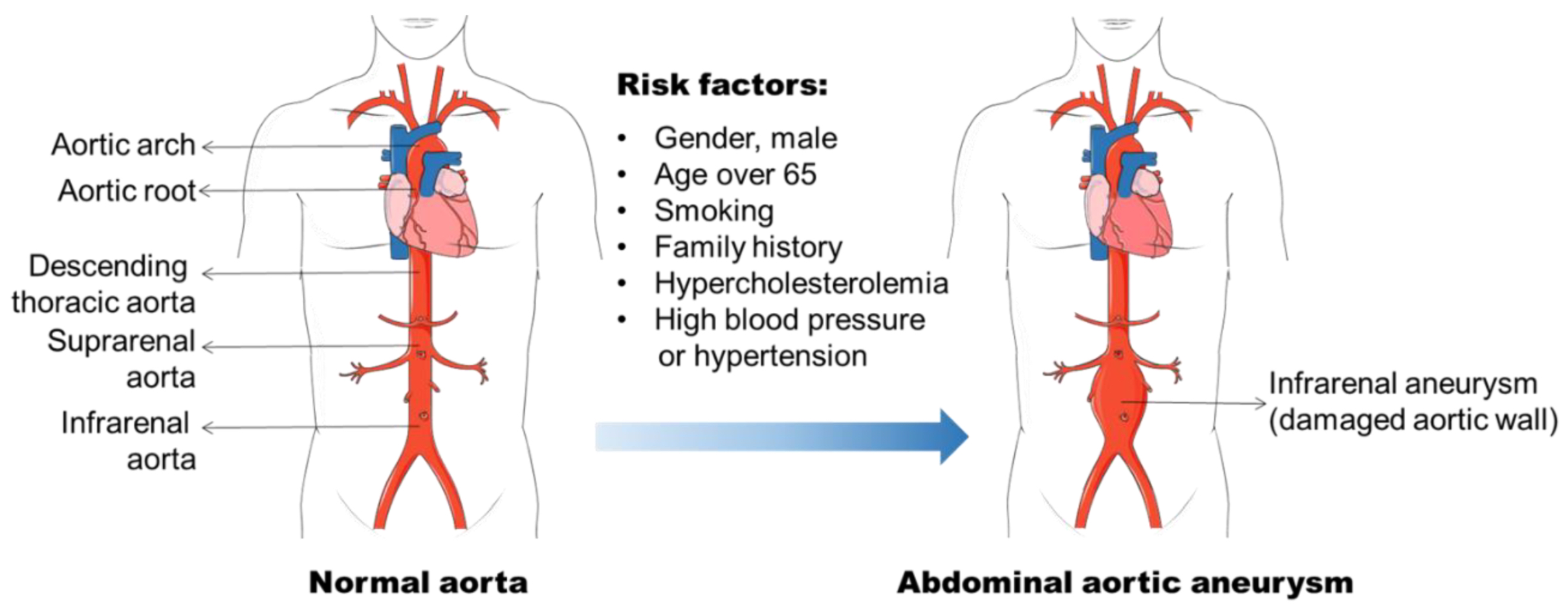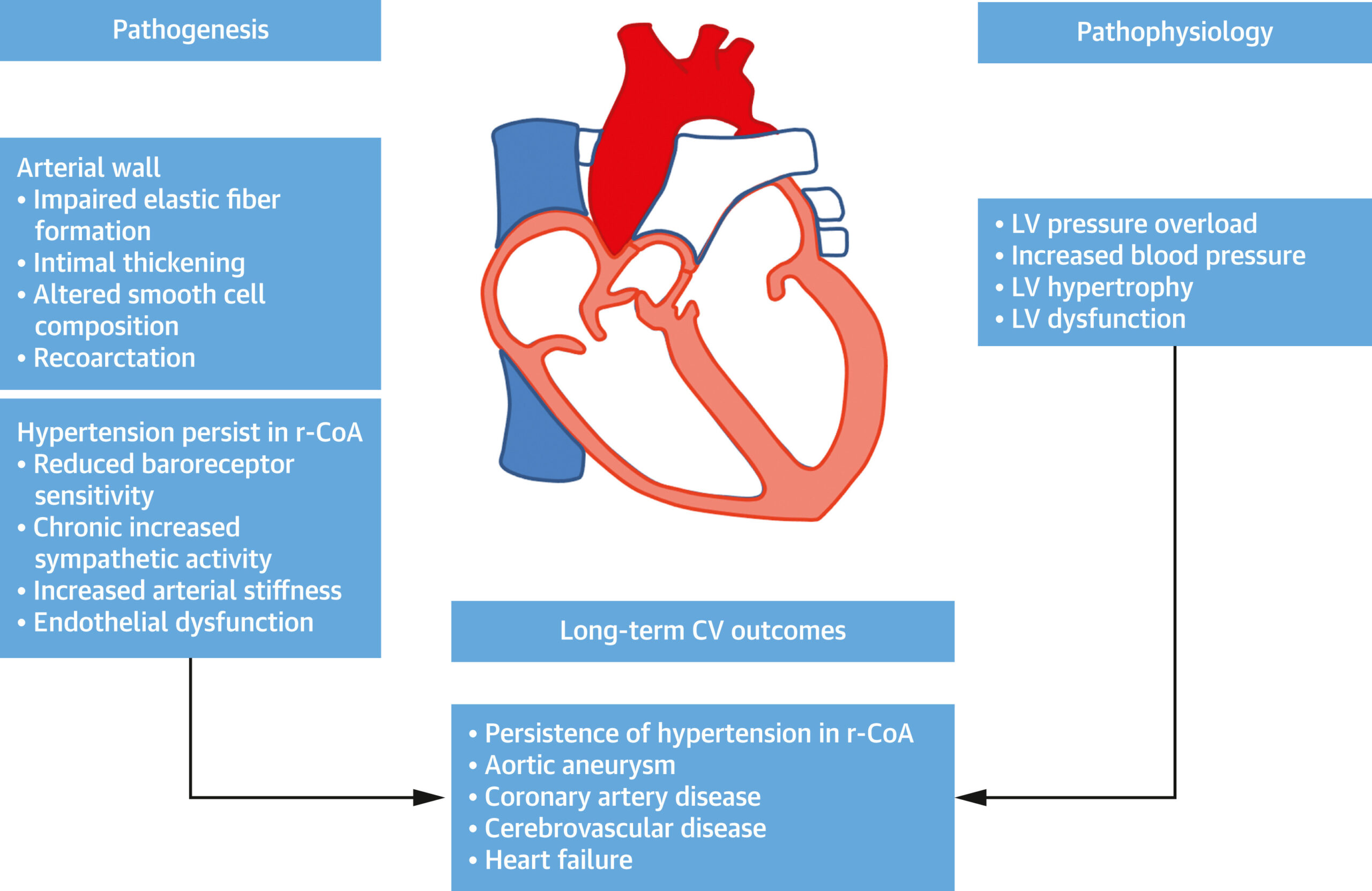 The anterior view of the heart: four chambers, major arteries and veins, and valves. Blue components indicate de-oxygenated blood pathways and red components indicate oxygenated blood pathways.