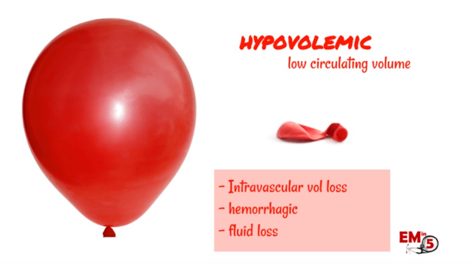 • Hypovolemic shock: This is an issue with low circulating volume and includes patients who have been bleeding, vomiting, having diarrhea, or are generally volume down.