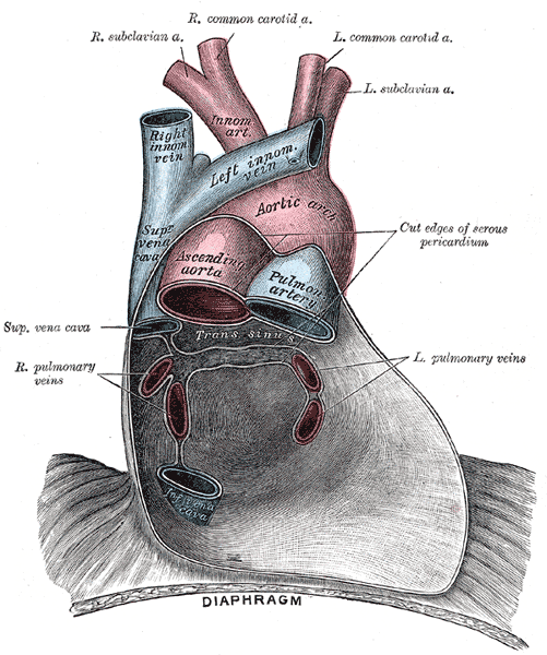 Inside the pericardium, the surface features of the heart are visible.