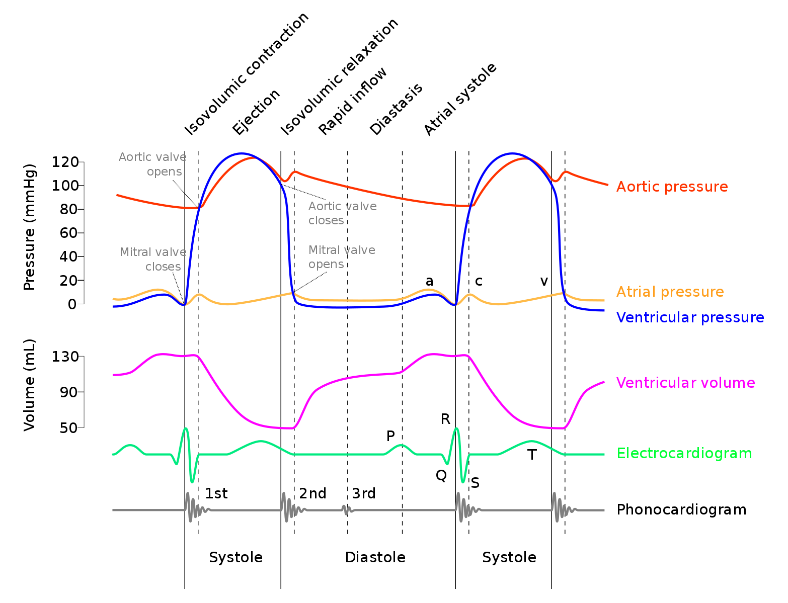 1. Cardiac cycle: the period of time that begins with contraction of the atria and ends with ventricular relaxation. Systole: the period of contraction that the heart undergoes while it pumps blood into circulation. Diastole: the period of relaxation that occurs as the chambers fill with blood.