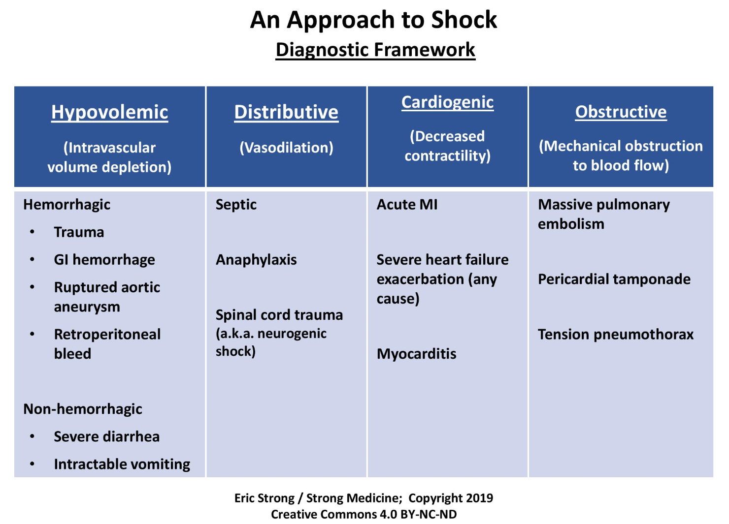 • Distributive shock: This is the one that we probably think about most commonly, and includes a wide range of categories. But they all share something in common, and therefore are managed in a similar fashion – they all have a problem with severe peripheral vascular vasodilation. Examples include sepsis, anaphylaxis, neurogenic shock, and various drugs and toxins.