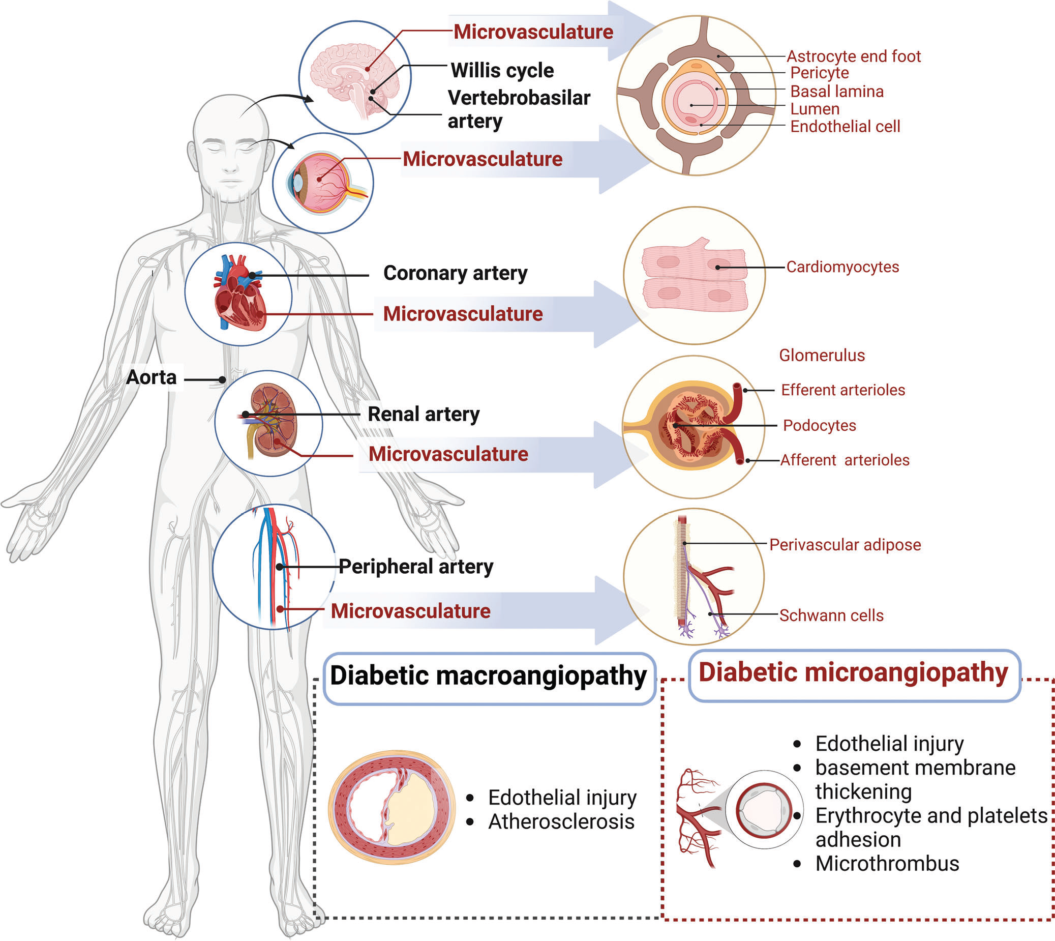Diabetic vascular diseases. Schematic overview of panvasculopathy in diabetes mellitus. Diabetic panvasculopathy involves the cardiac, cerebral, renal, ophthalmic, and peripheral systems. The macrovascular lesions are in black text. The microvascular lesions are in red. The microvascular system varies in different organs, which affects vascular function
