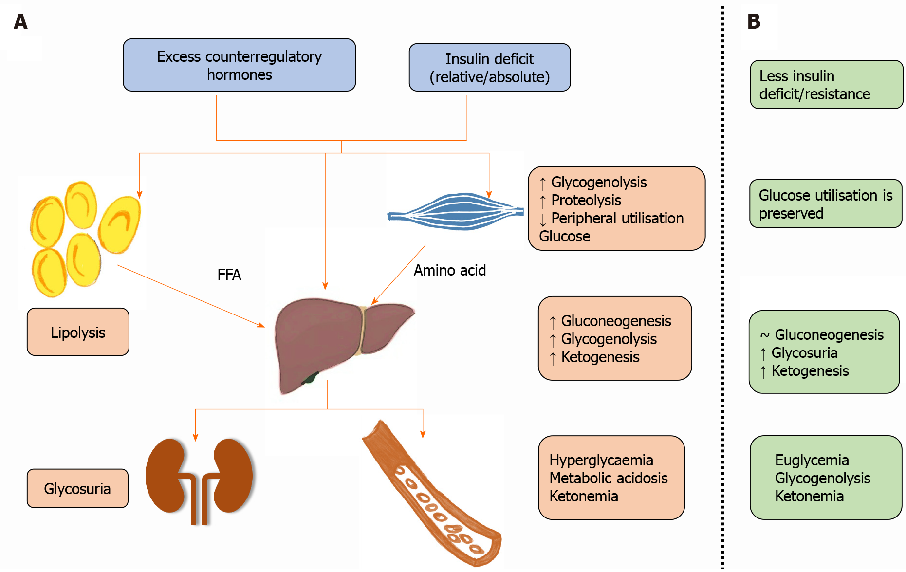 Ketone bodies (beta-hydroxybutyrate, acetoacetate, and acetone) are responsible for metabolic acidosis, while hyperglycemia through glycosuria and osmotic diuresis causes dehydration and hypovolemia. A: Pathophysiology of diabetic ketoacidosis; B: Pathophysiology of euglycemic diabetic ketoacidosis. FFA: Free fatty acids; ↑: Increase; ↓: Decrease; ~: No change.