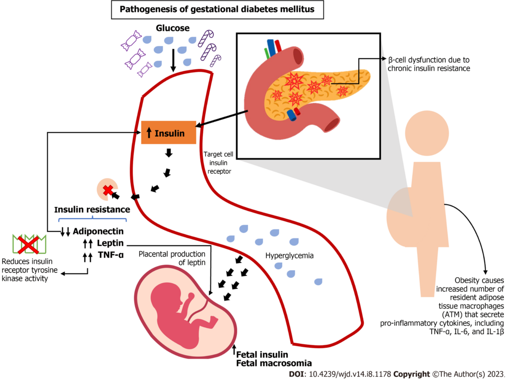 This image provides an overview of the underlying mechanisms and processes involved in developing gestational diabetes mellitus. TNF: Tumor necrosis factor; IL: Interleukin; ATM: Adipose tissue macrophages.