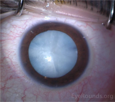 An image of the right eye captured from an intraoperative recording demonstrates the dense white cataract related to diabetes.