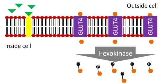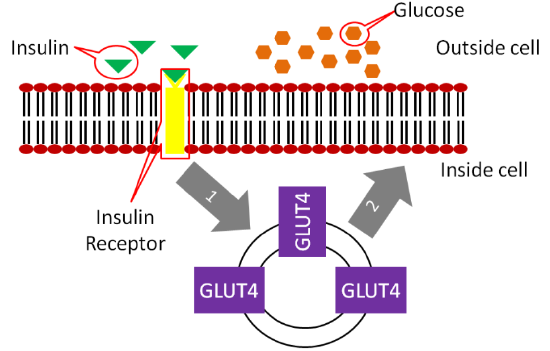Response of muscle and adipose cells to insulin; 1) binding of insulin to its receptor, 2) movement of GLUT4 vesicles to the cell surface.