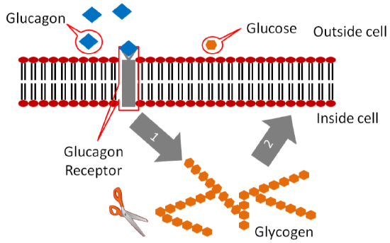 Glucagon binding to its receptor leads to the breakdown of glycogen into glucose.