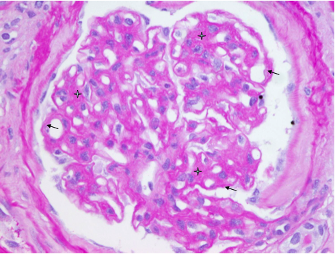 Diabetic nephropathy. Fibrin cap (arrow) is characteristic for diabetic nephropathy. It is caused by insudation and accumulation of glycosilated plasma proteins between the glomerular endothelium and the glomerular basement membrane. Diffuse expansion of mesangium is designated by four point star. PAS stain, X 200.
