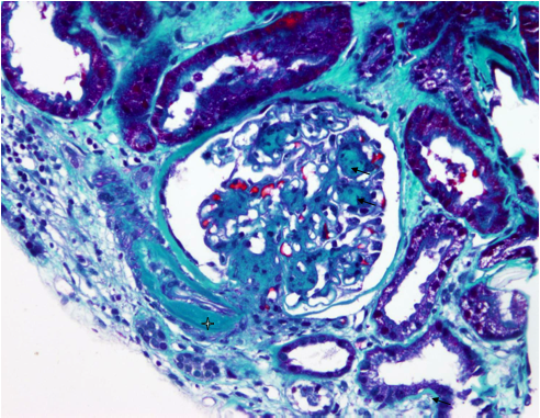 Diabetic nephropathy. Class III diabetic nephropathy. Sclerotic nodule (Kimmelstiel–Wilson) in nodular diabetic nephropathy (arrow). Mallory stain, X 100.