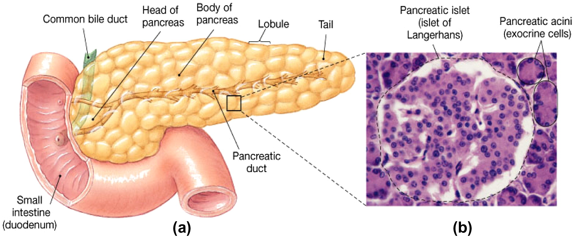 The pancreatic exocrine function involves the acinar cells secreting digestive enzymes that are transported into the small intestine by the pancreatic duct. Its endocrine function consists of the secretion of insulin (produced by beta cells) and glucagon (produced by alpha cells) within the pancreatic islets. These two hormones regulate the rate of glucose metabolism in the body. The micrograph reveals pancreatic islets. LM × 760. (Micrograph provided by the Regents of University of Michigan Medical School © 2012)