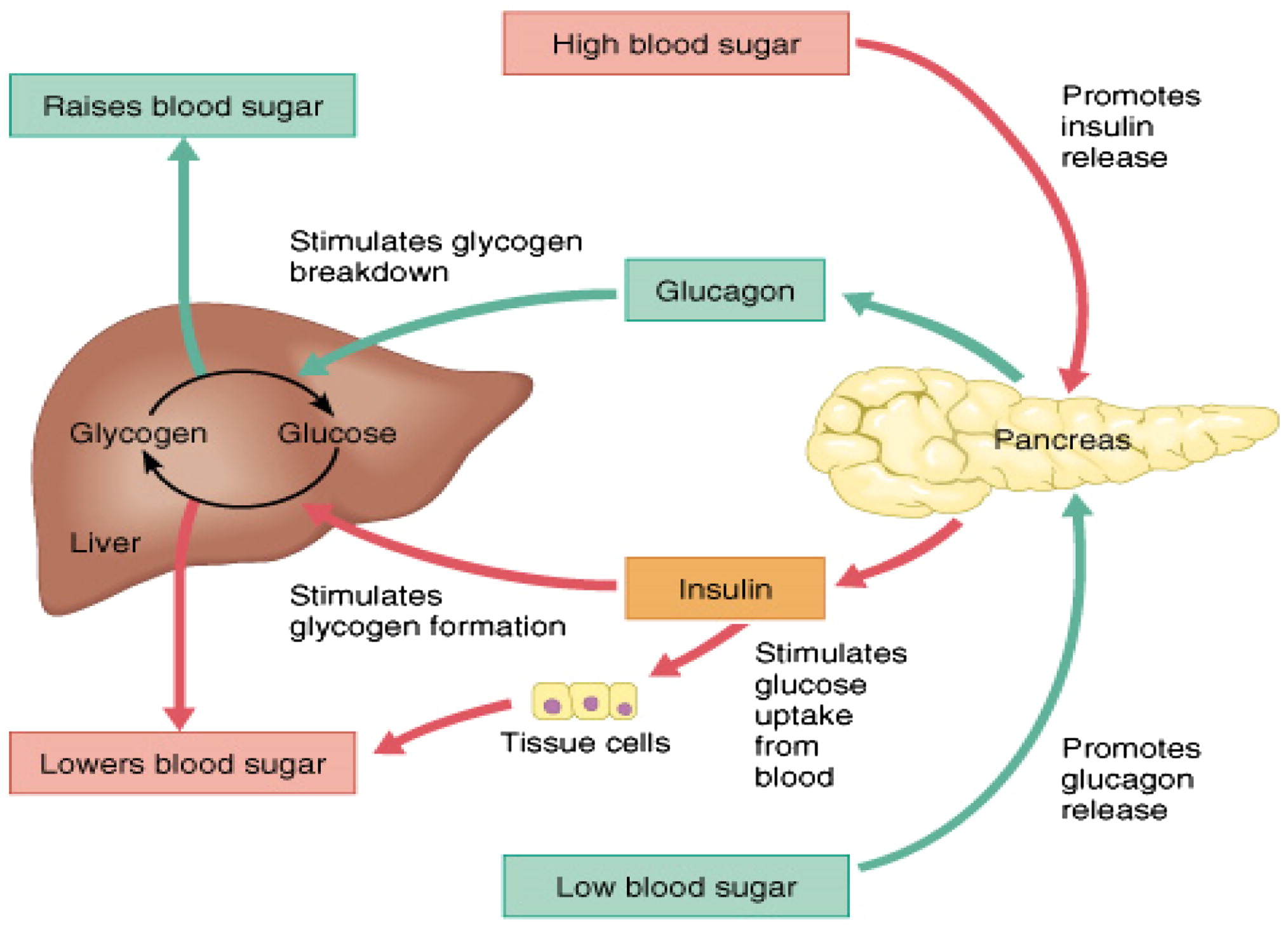 Insulin and glucagon use liver glycogen to maintain blood glucose. When blood-glucose falls, glucagon releases glucose from liver glycogen. When blood-glucose rises, insulin promotes glycogen production and storage.