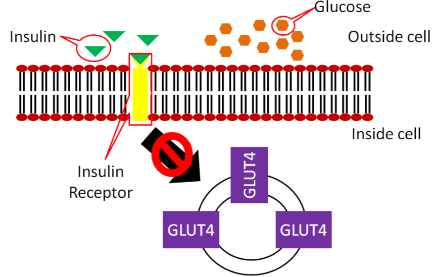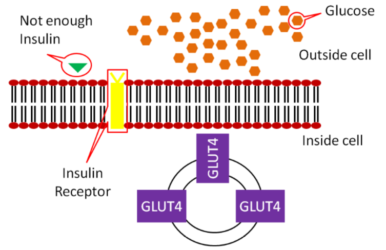 In Type 2 diabetes, the body produces enough insulin, but the person’s body resists it. In Type 2 diabetics, insulin binding to its receptor does not cause enough GLUT4 to move to the surface of the muscle and adipose cells, thus not enough glucose is taken up.