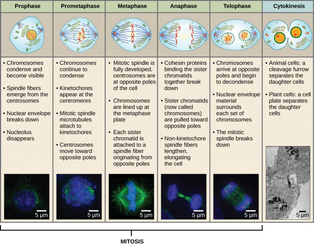 You may recall that the cell cycle consists of interphase (consisting of 3 phases: G1 phase, S-phase, and G2 phase), and mitosis (consisting of 4 stages: prophase, metaphase, anaphase, telophase), following by cytokinesis. In the process of 1 cell cycle, 1 cell grows, duplicates its organelles and DNA and then divides into 2 identical daughter cell. This entire process is tightly regulated by specific genes known as regulator genes. For example, there are regulatory genes that code for growth factors that stimulate cell cycling as well as growth-inhibiting factors that limit the rate of mitosis.
