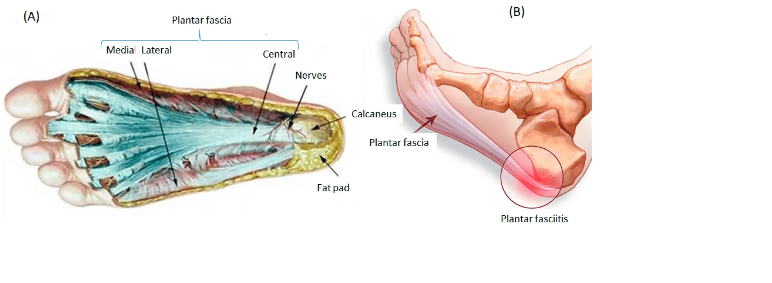 Irritation and inflammation of the plantar fascia, which is a thick, broad aponeurosis (or flat tendon) that extends along the bottom (or sole) of the foot supporting the arch. Aponeurosis and tendons are connective tissues that are composed largely of long fibrous collagen proteins. The plantar fascia originates at the medial tubercle of the calcaneus and then divides into 5 bands at the metatarsophalangeal joints (joints between metatarsals and proximal phalanges of toes) and extends forming fibrous flexor sheaths around tendons of flexor muscles of the toes (and located on the bottoms of the toes). The plantar fascia plays a role in walking acting like a spring and is estimated to carry a significant portion (~15%) of the body’s load (weight) acting as a tension bridge.