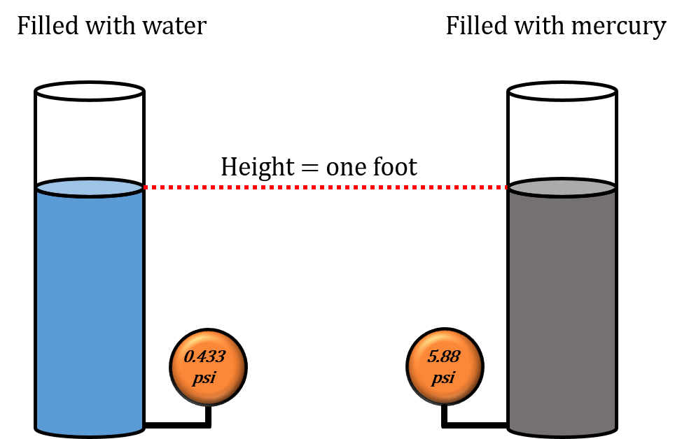 Visually it would look like the diagram below. One cylinder is filled with mercury while the other is filled with water. Both are filled to a height of one foot. If we were to put a pressure gauge at the bottom of each one we would get different readings.