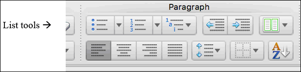 Each kind of list is suited for specific purposes, and generally conforms to a set of rules of construction and formatting. Learning to use the Paragraph formatting tool in Word (see Figure 3.2.4) is crucial to designing lists that are effective and accessible to assistive technology like screen readers.