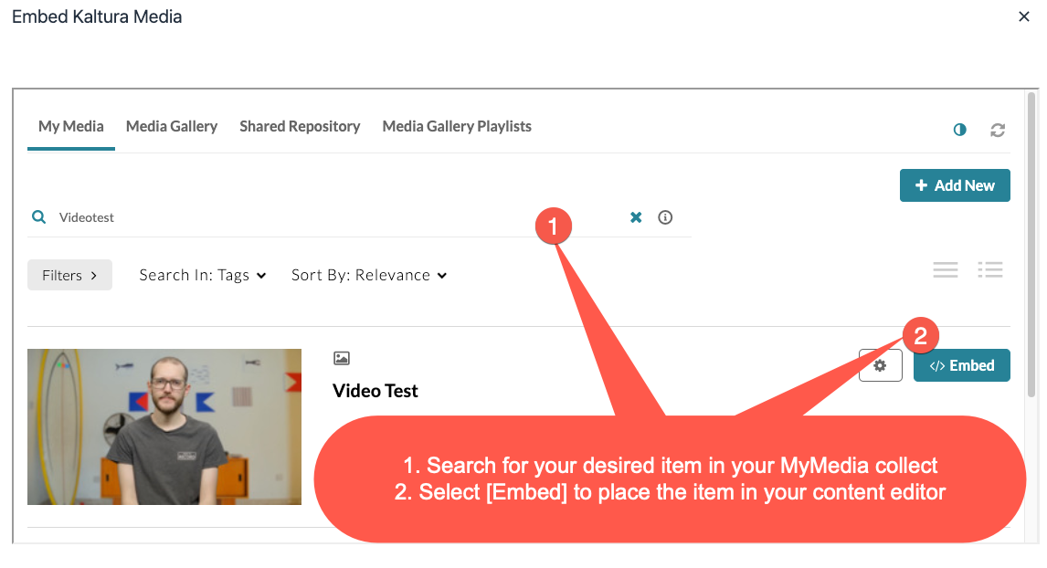 This feature will open your MyMedia area and allow you to embed audio and video items in your content from your MyMedia collections.