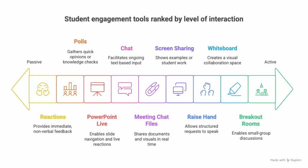 Keeping students engaged in a virtual classroom can be challenging—but Microsoft Teams offers a suite of interactive tools to support active learning, collaboration, and participation. This page outlines best practices and practical examples for fostering engagement in Teams-based lectures and seminars.